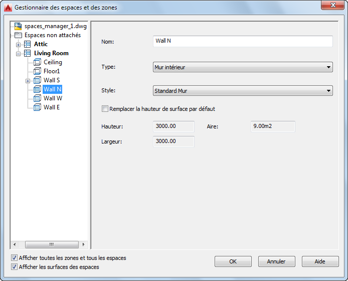 | Hauteur/Aire (espaces 3D extrudés uniquement) | sélectionnez Remplacer la hauteur de surface par défaut et entrez une nouvelle valeur de hauteur ou d'aire. Ces deux champs permettent uniquement de modifier la hauteur de la surface. |