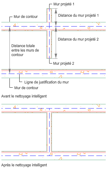 Si la distance du mur projeté est inférieure à la moitié de la distance totale entre les murs de contour, le mur est ajusté au premier mur de contour. Si la distance du mur projeté est égale ou supérieure à la moitié de la distance totale entre les murs de contour, le mur est prolongé jusqu'au second mur de contour.