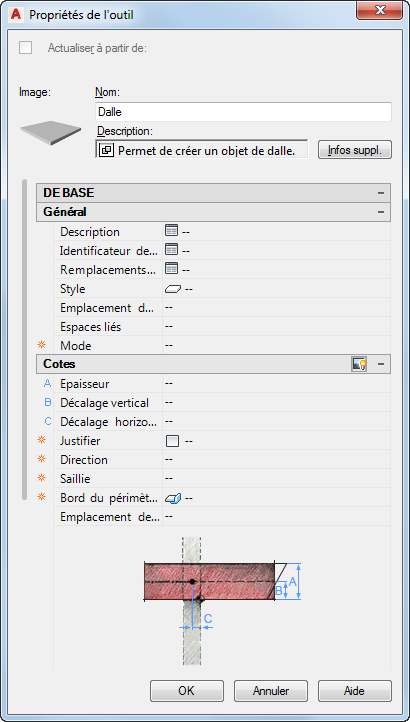 Propriétés d'outil de dalle avec un style de bord de dalle défini par défaut