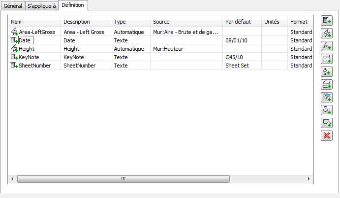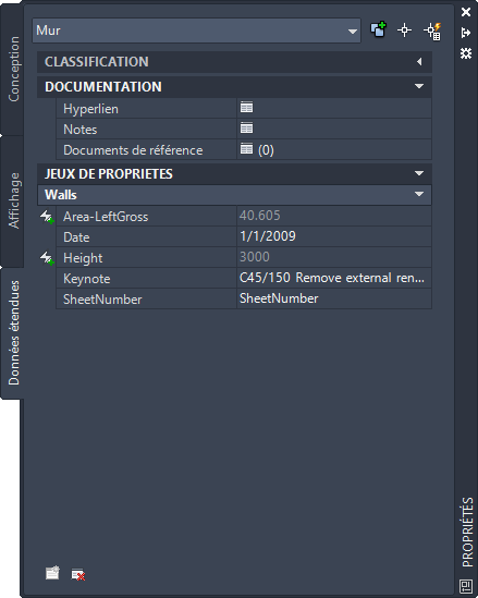 Propriétés de mur avec les champs de note d'identification, de date et de numéro de feuille