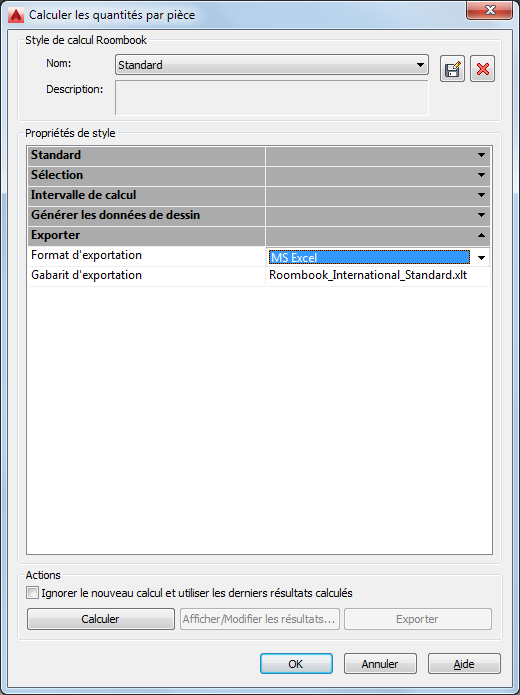- Dans la boîte de dialogue Calculer les quantités par pièce, sous Propriétés de style, liste Exporter, sélectionnez MS Excel dans la liste Format d'exportation.