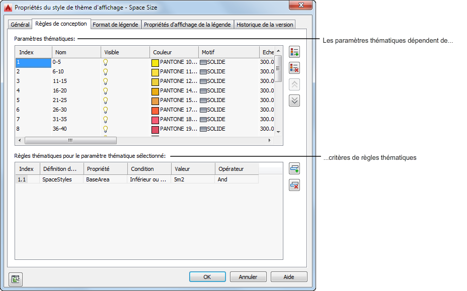Les thèmes d'affichage sont activés dans les dessins par le biais d'un outil de thème d'affichage qui sert à insérer une légende de thème d'affichage ou en activant une légende existante. La légende explique la signification des couleurs, des hachures ou des remplissages spécifiés dans le thème.