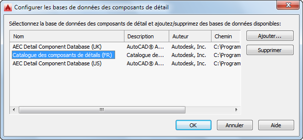 - Dans la page de l'onglet Contenu AEC, cliquez sur le bouton Ajouter/Supprimer correspondant aux bases de données des composants de détail.