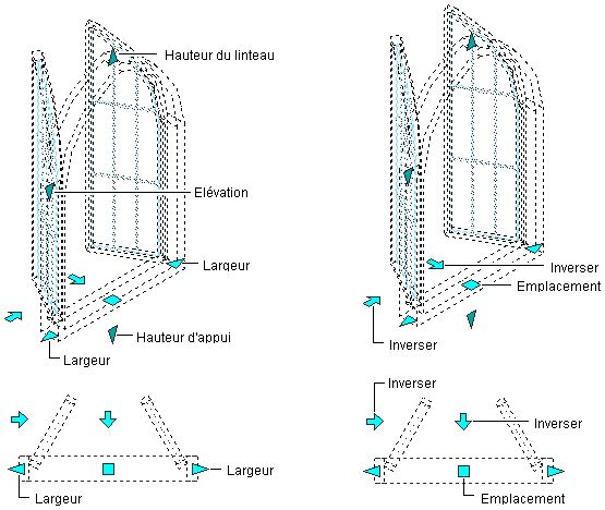 Permet d'inverser le côté des charnières de la fenêtre. Pour une fenêtre d'angle, les valeurs des largeurs 1 et 2 sont inversées. L'ancrage du pan de fenêtre qui était ancré sur le premier mur sélectionné est également inversé. |