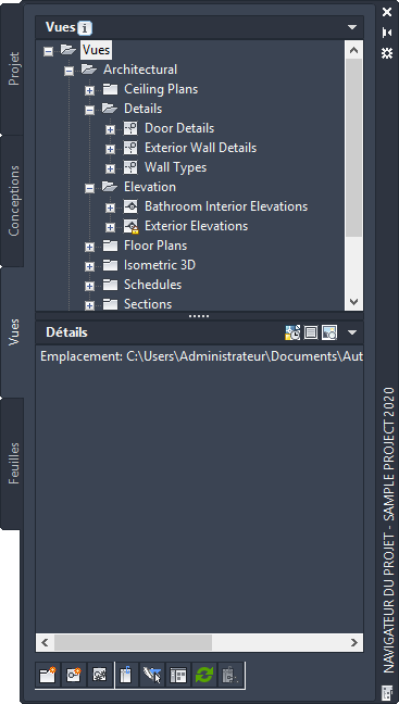L'onglet Vues de la palette du navigateur du projet permet de créer des vues pour les données de construction. Les vues contiennent des conceptions et constituent l'emplacement principal pour l'ajout d'annotations (notes, étiquettes, cotes, etc.) dans le projet. Après la création d'un dessin de vue, vous pouvez y définir des vues d'espace objet.