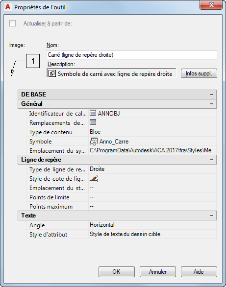 | Ligne de repère/Emplacement du style de cote de ligne de repère | Indique l'emplacement du style de cote s'il diffère du style de cote du dessin en cours. Cliquez sur la propriété et utilisez l'option Parcourir proposée dans la liste déroulante pour localiser le fichier de style et indiquer son chemin d'accès. Si cette propriété n'est pas définie (--), seuls les styles du dessin en cours sont utilisés. |