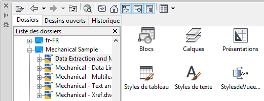 L'arborescence de la partie gauche de la fenêtre DesignCenter et les onglets DesignCenter permettent de rechercher un contenu et de le charger dans la zone de contenu.