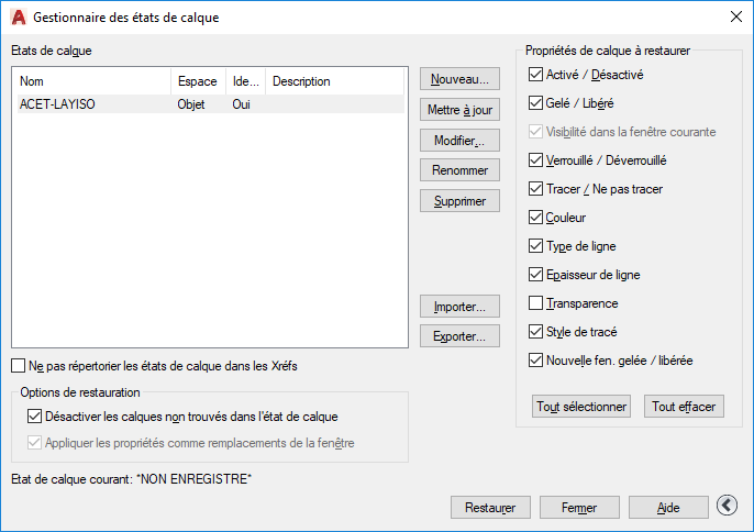 Affiche la liste des états de calques enregistrés dans le dessin.