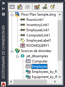 Le Gestionnaire de connexion BD est une fenêtre contenant un jeu de boutons et une arborescence qui peut être ancrée et redimensionnée. Il permet d'ouvrir la fenêtre Affichage des données afin de visualiser ou de modifier une table de base de données. Vous pouvez également associer divers objets de base de données (gabarits de liens, d'étiquettes et requêtes, etc.) avec un dessin.