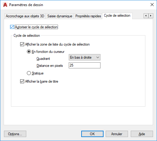 Le cycle de sélection permet de sélectionner des objets qui se chevauchent au moyen de la combinaison de touches Maj+Espace. Vous pouvez indiquer si une icône en forme de curseur bleu doit s'afficher pour indiquer les objets qui se chevauchent. Par ailleurs, vous avez la possibilité de configurer les paramètres d'affichage de la zone de liste Sélection.