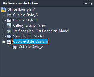 Le niveau supérieur de cet affichage indique le dessin courant. Les fichiers référencés apparaissent au niveau suivant. Vous pouvez ouvrir les fichiers référencés qui contiennent leur propre références de fichier imbriquées pour afficher d'autres niveaux. Lors de la sélection, vous ne pouvez pas sélectionner plus d'une référence de fichier à la fois.