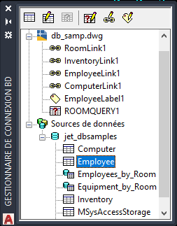 Contient des noeuds pour chacun des dessins ouverts et un noeud Sources de données qui contient toutes les sources de données configurées sur votre système.