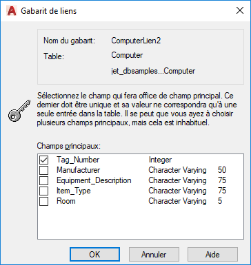 Affiche tous les champs disponibles pour la table de base de données courante, ainsi que le type de champ et, pour les champs de caractères, la longueur de champ. Pour spécifier les champs clés du gabarit de liens, sélectionnez la case à cocher située à gauche du nom de champ.