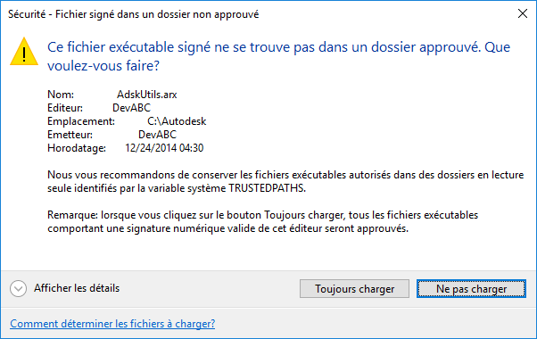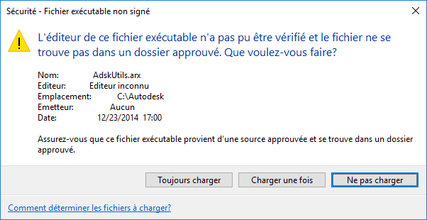 Lorsque vous chargez un fichier programme signé numériquement, le programme AutoCAD en vérifie la signature numérique. Selon que la signature numérique a pu être vérifiée ou non, un message autorisant ou refusant le chargement du fichier dans l'environnement de dessin apparaît.