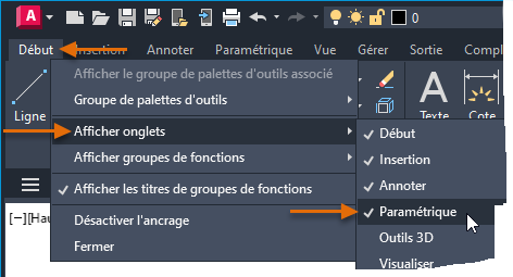 Dans cet exercice, vous allez masquer l'onglet de ruban Paramétrique et afficher le groupe de fonctions Coordonnées dans l'onglet Vue.