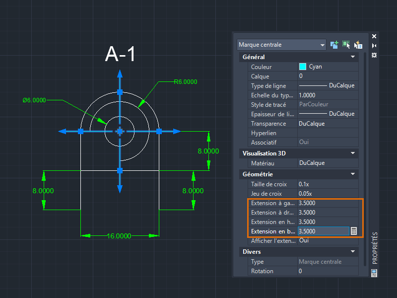 Les propriétés de la marque de centre sélectionnée s’affichent dans la palette Propriétés.