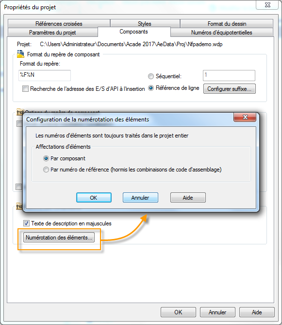 Plusieurs propriétés du projet ont une incidence sur la numérotation des éléments. Veillez à définir ces propriétés en fonction de vos préférences, avant de procédez à la remise en séquence des numéros d'éléments.