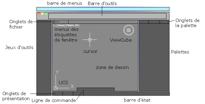 Par défaut, l'interface utilisateur affiche les palettes et les barres autour de la zone de dessin. En outre, plusieurs contrôles s'affichent dans la zone de dessin.