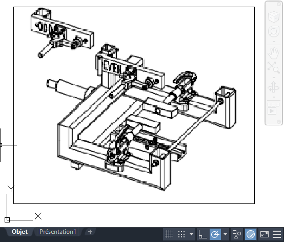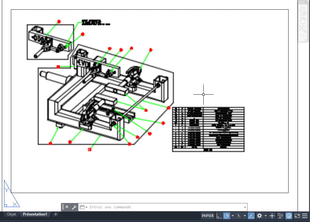 - Pour préparer le dessin en vue de l'impression, passez à l'espace papier. De là, vous pouvez définir différentes présentations avec des cartouches et des notes. Sur chaque présentation, vous pouvez créer des fenêtres de présentation qui affichent des vues différentes de l'espace objet. Dans les fenêtres de présentation, vous effectuez une mise à l'échelle des vues de l'espace objet en fonction de l'espace papier. Une unité dans l'espace papier représente la distance réelle sur une feuille de papier, en millimètres ou en pouces, selon la configuration de votre mise en page.