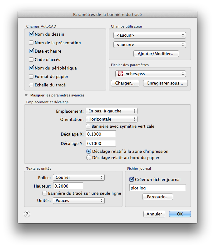 Ecrit les informations de bannière dans un fichier journal au lieu de les placer dans le tracé ou combine les deux opérations. Vous pouvez créer le fichier journal même si la bannière de tracé est désactivée.