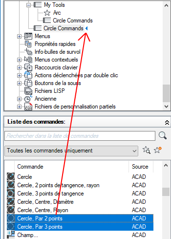 4. Dans le volet Liste des commandes, faites glisser la commande que vous voulez ajouter à l'icône déroulante dans le volet Personnalisations dans <nom de fichier>.