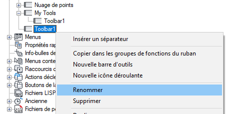 3. Cliquez avec le bouton droit de la souris sur la barre d'outils nommée Barre d'outils1, et non pas sur l'icône déroulante. Cliquez sur Renommer et entrez le nouveau nom.