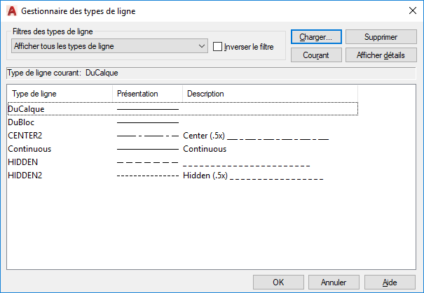 Affiche les types de ligne chargés en fonction de l'option définie dans Filtres des types de ligne. Pour sélectionner ou désélectionner rapidement tous les types de ligne, cliquez avec le bouton droit de la souris sur la liste des types de ligne pour afficher le menu contextuel.