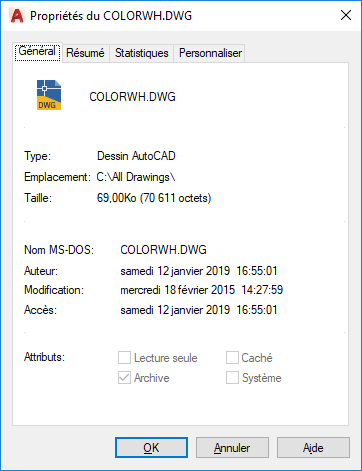 Affiche des informations en lecture seule fournies par le système d'exploitation concernant le fichier de dessin.