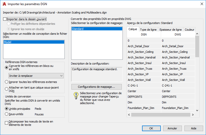 Standard est la configuration de mappage par défaut qui extrait des données du dessin exporté et applique un mappage automatique aux calques DGN, types de ligne, épaisseurs de ligne et couleurs, tels qu'ils apparaissent dans l'aperçu de mappage.