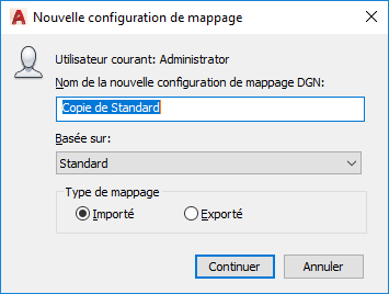 Permet de configurer le mappage pour l'importation ou l'exportation de fichiers DGN.