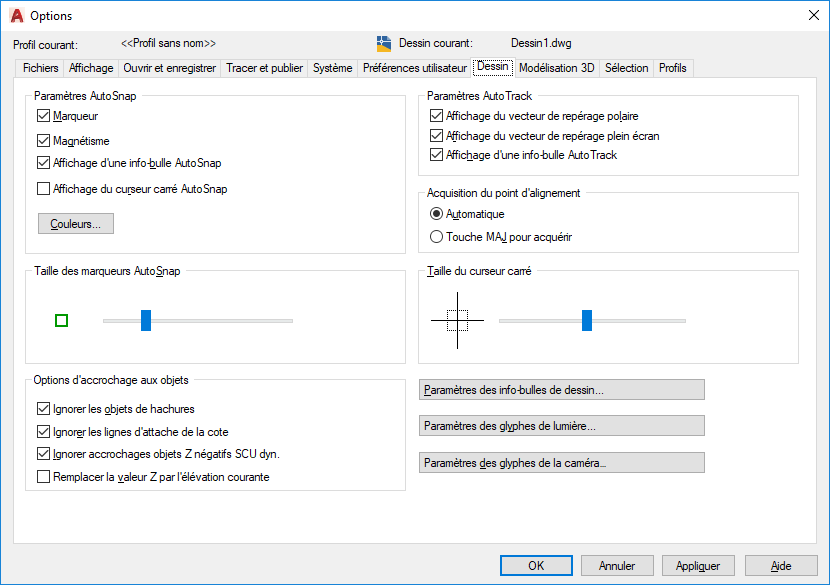 Gère l'affichage du marqueur AutoSnap. Le marqueur est un symbole géométrique qui s'affiche lorsque le réticule est placé sur un point d'accrochage (variable système AUTOSNAP).