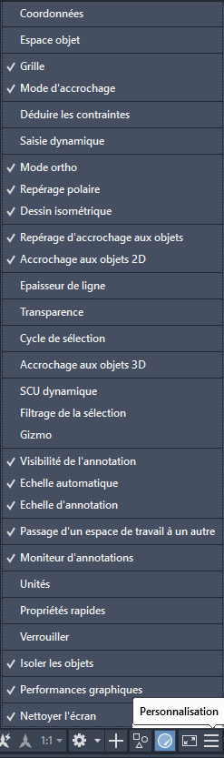 Remarque : Par défaut, les coordonnées ne sont pas affichées dans la barre d'état. Pour afficher les coordonnées dans la barre d'état, sélectionnez Coordonnées dans le bouton Personnalisation de la barre d'état.