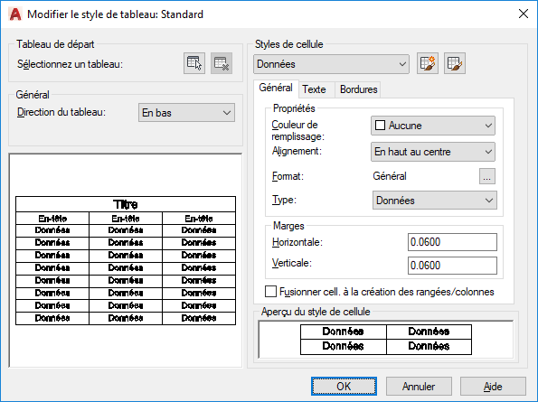 Vous permet de spécifier un tableau dans votre dessin qui sera utilisé comme exemple pour le formatage de ce style de tableau. Une fois que vous avez sélectionné un tableau, vous pouvez spécifier la structure et le contenu à copier de ce tableau vers le style de tableau.