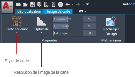 Si vous êtes connecté à votre compte Autodesk, vous pouvez modifier la résolution des images de la carte, modifier leur étendue, ajuster leur opacité ou les mettre à jour vers la version la plus récente disponible dans le service de cartographie en ligne.