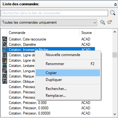 Cette liste est filtrée afin de ne laisser voir que les commandes définies par l'utilisateur qui ont été ajoutées aux fichiers de personnalisation chargés.