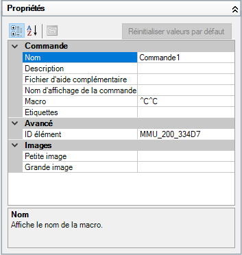 • Dans la zone Description, entrez la description de la commande. La valeur s'affiche sur la barre d'état ou dans une info-bulle.