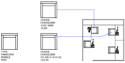 L'illustration suivante présente un bloc "chaise" comportant quatre attributs : type, fabricant, modèle et coût. Etant donné que les étiquettes ont été définies en tant que variables, des informations spécifiques sur chaque occurrence peuvent être ajoutées pour chaque référence de bloc insérée.