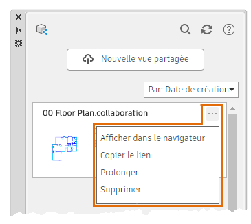 Démarre le processus de création d'une vue partagée. Affiche la boîte de dialogue Partager la vue avec plusieurs options. Ensuite, les données sont extraites du dessin afin de créer une vue qui sera provisoirement publiée à un emplacement de votre compte Autodesk Account Web et mobile, et un lien (que vous pouvez partager) vers cet emplacement est généré.