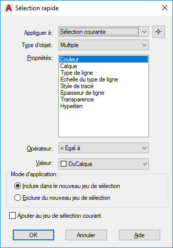 Si l'option Ajouter au jeu de sélection courant est sélectionnée, les critères de filtrage sont appliqués à la totalité du dessin.