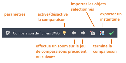 Lorsqu'une opération de comparaison est lancée, la barre d'outils de comparaison de fichiers DWG s'affiche.