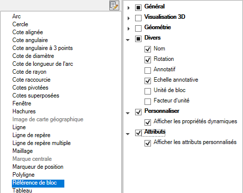 Contrôle de l'affichage des propriétés personnalisées et des attributs pour les références de bloc