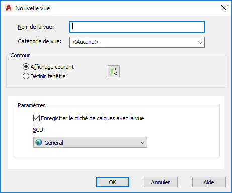Pour les vues des présentations et des modèles, spécifie un SCU à enregistrer avec la nouvelle vue.