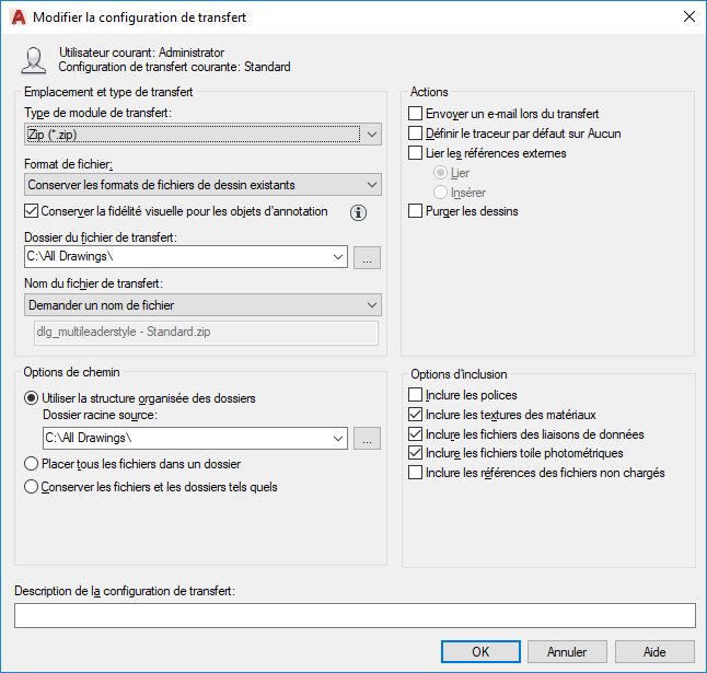 Si ce champ est laissé tel quel, le fichier de transfert est créé dans le dossier contenant le premier fichier dessin spécifié. Dans un contexte de jeu de feuilles, le fichier de transfert est créé dans le dossier contenant le fichier de données de jeu de feuilles (DST). (Non disponible pour AutoCAD LT).