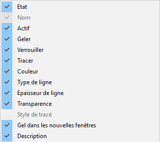Répertorie toutes les colonnes par leur nom. Une coche indique que la colonne est incluse dans l'affichage. Cliquez sur le nom d'une colonne pour l'afficher ou la masquer. Les paramètres Gel de la fenêtre, Couleur de fenêtre, Type de ligne de fenêtre, Epaisseur de ligne de fenêtre et Style de tracé de fenêtre sont disponibles uniquement lorsqu'une fenêtre de présentation est active.