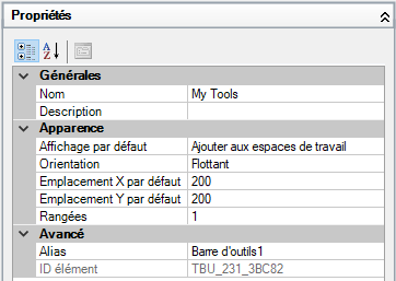 Remarque : Les modifications apportées ici aux propriétés d'une barre d'outils concernent uniquement l'apparence initiale de la barre d'outils après le chargement du fichier de personnalisation (CUIx). Il est recommandé d'utiliser un espace de travail pour contrôler l'apparence d'une barre d'outils.