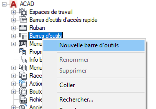 Une nouvelle barre d'outils (nommée Barre d'outils1) est placée au bas de l'arborescence des barres d'outils.