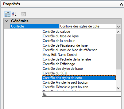 4. Dans le volet Propriétés, dans la zone Contrôle, cliquez sur une flèche pour afficher la liste des contrôles de barre d'outils disponibles.