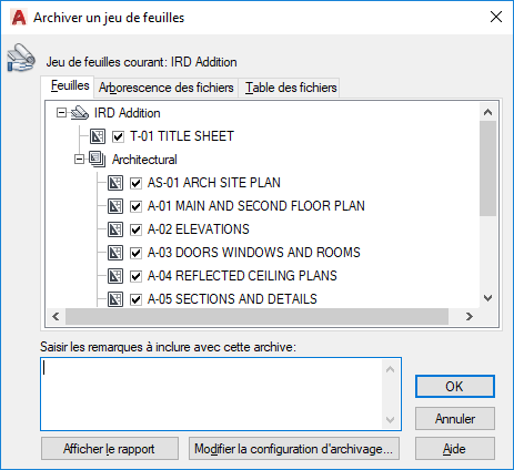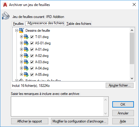 Répertorie les feuilles à inclure dans le module d'archive dans l'ordre des feuilles et conformément à l'organisation du sous-jeu. Un jeu de feuilles doit être ouvert dans le gestionnaire du jeu de feuilles. Vous pouvez sélectionner la commande Archiver dans le menu contextuel qui s'affiche lorsque vous cliquez avec le bouton droit de la souris sur le noeud du jeu de feuilles de premier niveau. Vous pouvez également entrer ARCHIVER sur la ligne de commande.