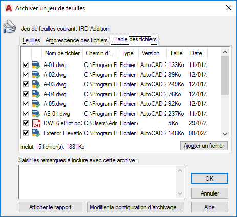 Répertorie les fichiers à inclure dans le module d'archive dans un format de table. Par défaut, tous les fichiers associés au dessin courant (tels que les fichiers externes, les styles de tracé et les polices) sont listés. Vous pouvez ajouter des fichiers au module d'archive ou supprimer des fichiers existants. Les fichiers associés qui sont référencés par des URL ne sont pas inclus dans le module d'archive.