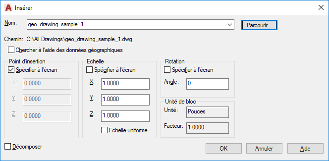 Permet d'indiquer le nom du bloc ou du dessin à insérer, ainsi que son emplacement.
